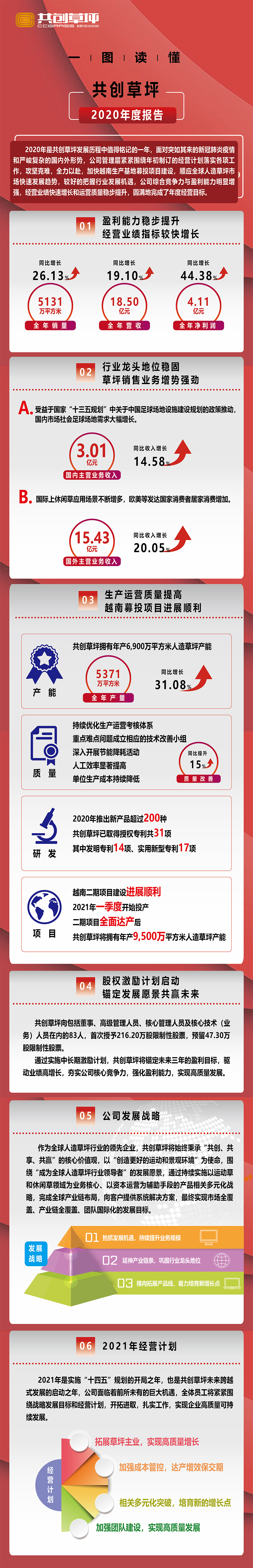 2021年4月8日,共創(chuàng)草坪(股票代碼:605099)正式披露2020年度報告,公司2020年實現(xiàn)營業(yè)收入18.5億,同比增長19.10%,增幅創(chuàng)近4年新高;實現(xiàn)歸母凈利潤4.1億,同比增長44.38%;每股收益為1.11元。靚麗的經(jīng)營業(yè)績、高質(zhì)量的增長趨勢獲得資本市場的肯定,當日股票漲停報收。